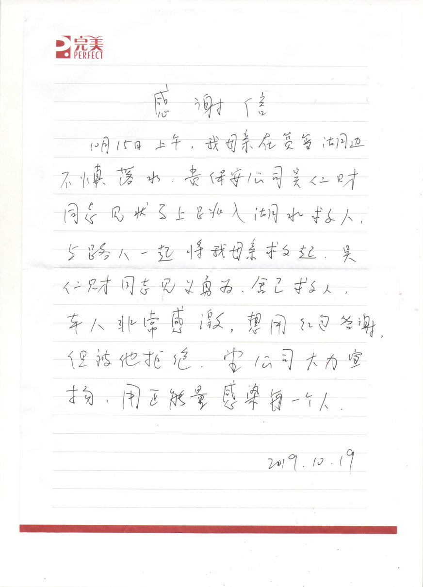 吳仁財(cái)同志是一個(gè)行事低調(diào)、不愛張揚(yáng)的人,他不希望別人知道他救人的事,若不是事主家屬到公司致謝,大家都不知道他不會(huì)游泳卻奮勇救人的善舉。“沒(méi)想那么多,當(dāng)時(shí)看到危急情況,只是一種本能而已。”這是吳仁財(cái)同志在交談中說(shuō)的最多的一句話。沒(méi)有什么豪言壯語(yǔ),但說(shuō)的字字震撼人心。“見義勇為,舍己救人”錦旗上8個(gè)金黃的大字分外耀眼,小小的錦旗不僅包含著市民對(duì)保安員最真誠(chéng)的謝意,也是對(duì)保安員吳仁財(cái)同志高尚品德的高度贊揚(yáng),更讓我們從一個(gè)普通的保安員身上看到了人性真、善、美的本能,他用實(shí)際行動(dòng)展現(xiàn)了特區(qū)保安人的高尚品質(zhì)和良好的精神風(fēng)貌,向社會(huì)傳遞了源源不斷的暖心正能量。