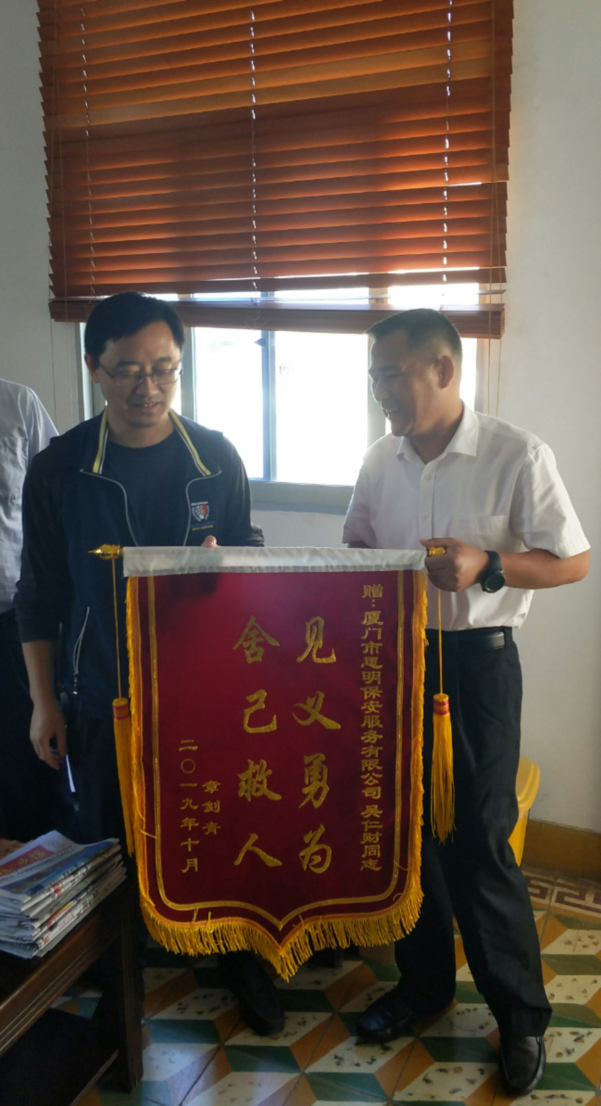 近日,市民章先生專程帶著一面印有“見義勇為,舍己救人”字樣的錦旗和一封感謝信到思明保安公司,緊握著葉總經(jīng)理的手連聲致謝,感謝保安員吳仁財(cái)同志奮不顧身救起不慎落水的老母親,同時(shí)請(qǐng)求保安公司要大力弘揚(yáng),學(xué)習(xí)吳仁財(cái)同志恪盡職守、不懼危險(xiǎn),奮勇救人的高尚品質(zhì),引領(lǐng)時(shí)代新風(fēng)尚,傳遞社會(huì)正能量。