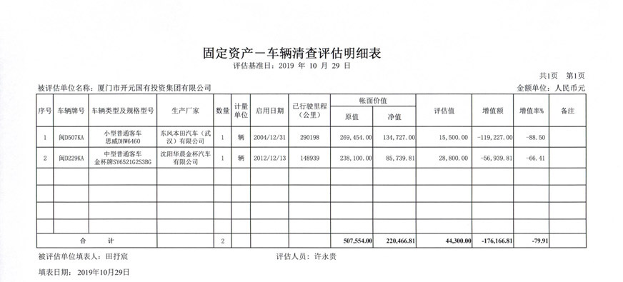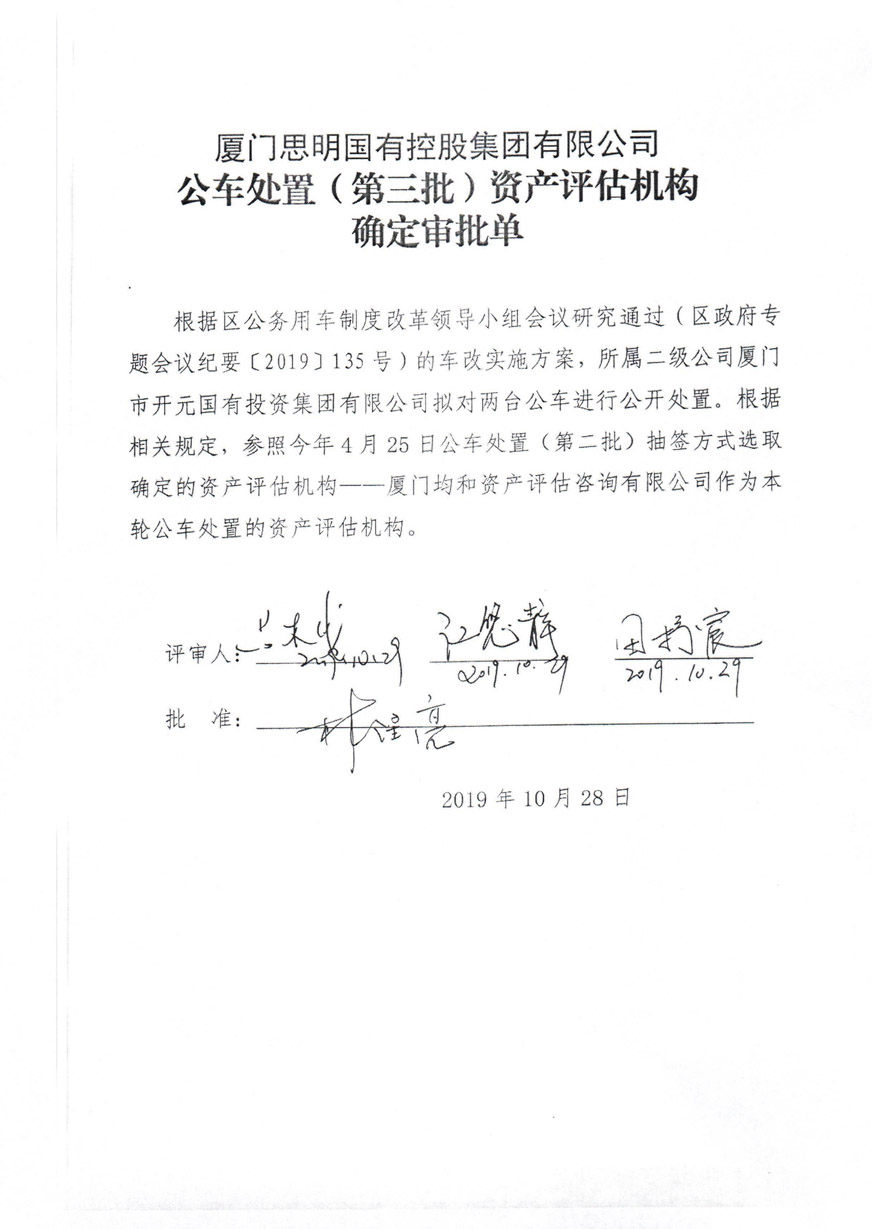根據(jù)廈門市思明區(qū)人民政府關(guān)于區(qū)屬國企車改實施方案專題會議紀要(〔2019〕135號)及思明控股《關(guān)于落實車改實施方案相關(guān)事宜的通知》(思明控股辦〔2019〕9號)文的相關(guān)精神。我司委托廈門均和房地產(chǎn)土地評估咨詢有限公司對公車處置(第三批)的資產(chǎn)進行評估,該公司已向我司提交資產(chǎn)評估結(jié)果初稿?,F(xiàn)將評估結(jié)果進行公示,如有異議,歡迎來電來函反映。