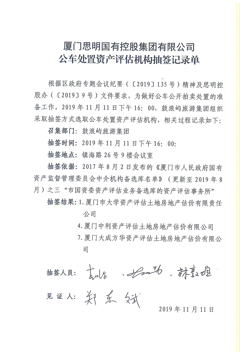 附件:1.《思明控股公車處置(第四批)資產(chǎn)評估機構(gòu)抽簽記錄單》;