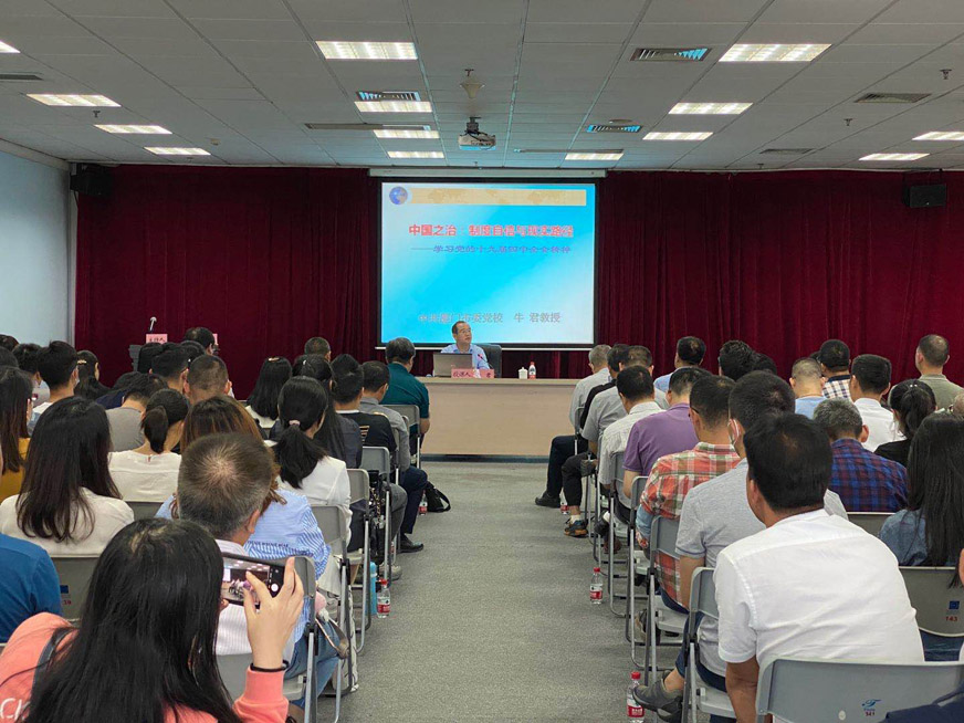 會上,牛君教授以“中國之治:制度自信與現(xiàn)實路徑-學(xué)習(xí)黨的十九屆四中全會精神”為題,從“四中全會與《決定》的意義影響”、“推進(jìn)國家治理現(xiàn)代化的邏輯路徑”、“把制度優(yōu)勢轉(zhuǎn)化為國家治理效能”等三個方面深入解讀黨的十九屆四中全會的深刻背景和重大意義,對全會《決定》提出的總體要求、總體目標(biāo)和重點任務(wù)進(jìn)行了系統(tǒng)解讀。講授中,牛君教授特別結(jié)合中國應(yīng)對新冠肺炎重大疫情挑戰(zhàn)等典型事例,深刻闡述了中國特色社會主義制度和國家治理體系的顯著優(yōu)勢,觀點深刻、內(nèi)涵豐富,既有深入淺出的理論闡述,也有聯(lián)系實際的對策思考。