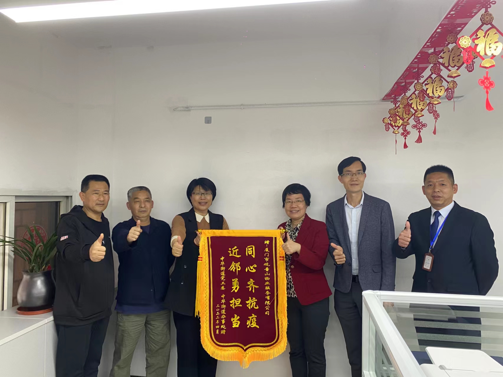 4月20日下午,中華街道黨工委副書記、街道辦主任王雪梅率街道四級調(diào)研員嚴(yán)開松、黨政辦負責(zé)人蘇江圳一行給思明控股觀音山物業(yè)所屬中山路服務(wù)中心送上錦旗和慰問信,感謝思明控股集團觀音山物業(yè)中山路服務(wù)中心團隊全力配合協(xié)助街道疫情防控工作,對團隊致以崇高的敬意和衷心的感謝。