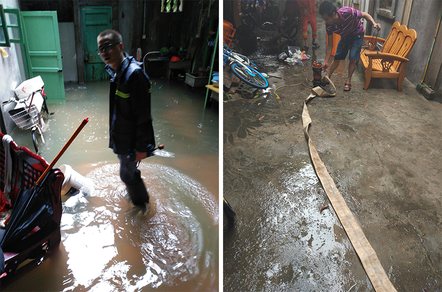 當工作人員巡查至雙蓮池時,雙蓮池已成一片澤國,而雙蓮池52號更是猶如海中孤島一樣積水極深,工作人員不顧積水之深,穿過過膝的積水來到住戶家中,拿起掃把、拖把幫忙掃除房屋內(nèi)的積水,并向上級申請抽水泵排水已解燃眉之急。經(jīng)過工作人員與住戶的不懈努力,積水終于被清理干凈,也還住戶一個安心的家。