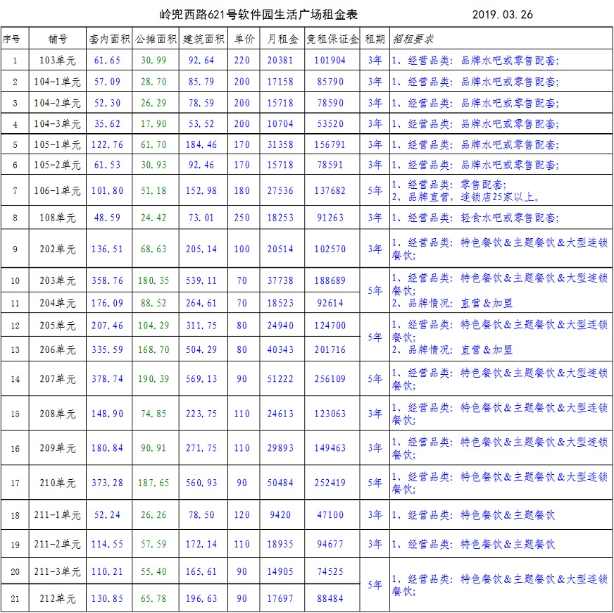 6、競租保證金:詳見附表(軟件園生活廣場公開招租信息表)