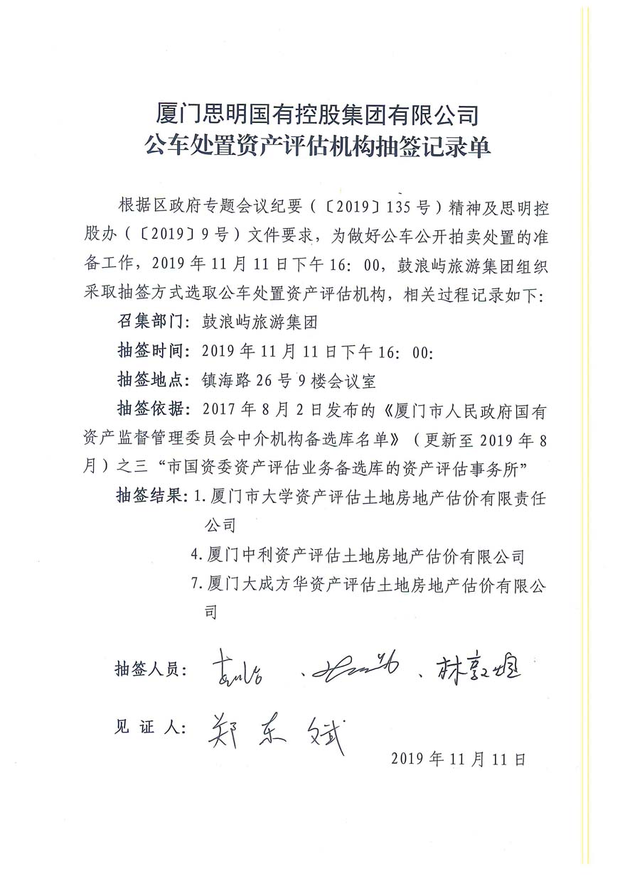 附件:1.《思明控股公車處置(第四批)資產(chǎn)評(píng)估機(jī)構(gòu)抽簽記錄單》;