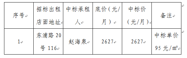 根據思明區(qū)國有企業(yè)資產出租管理的相關制度,我公司于2020年12月18日10:00在廈門市禾祥西路51號10A中山房地產公司會議室,進行浦南安置小區(qū)東浦路20號103等13間店面公開招租現(xiàn)場開標。僅一間店面成交,其余12間店面因無人應標而流標。現(xiàn)通過思明控股網站對外發(fā)布成交公告,內容如下: