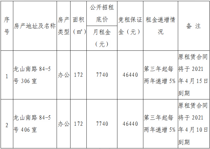 根據(jù)國有企業(yè)資產(chǎn)出租管理相關制度,我司決定對位于龍山南路84-5號306、406室房產(chǎn)對符合入駐條件的意向承租人進行公開競價招租,具體信息如下: