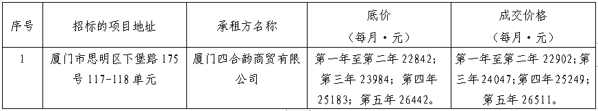 根據(jù)思明區(qū)國有企業(yè)資產(chǎn)出租管理的相關(guān)制度,我司2021年7月8日上午10:00起于廈門市思明區(qū)臺(tái)東路157號(hào)102單元會(huì)議室進(jìn)行公開招租現(xiàn)場開標(biāo),現(xiàn)通過思明控股網(wǎng)站對外發(fā)布成交公告,內(nèi)容如下: