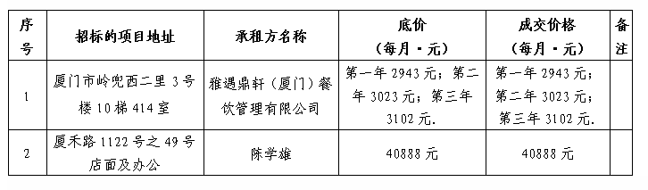 根據(jù)思明區(qū)國(guó)有企業(yè)資產(chǎn)出租管理的相關(guān)制度,我司2022年1月25日上午9:00起于廈門市前埔工業(yè)園1號(hào)全和公司七樓會(huì)議室進(jìn)行公開招租現(xiàn)場(chǎng)開標(biāo),現(xiàn)通過(guò)思明控股網(wǎng)站對(duì)外發(fā)布成交公告,內(nèi)容如下: