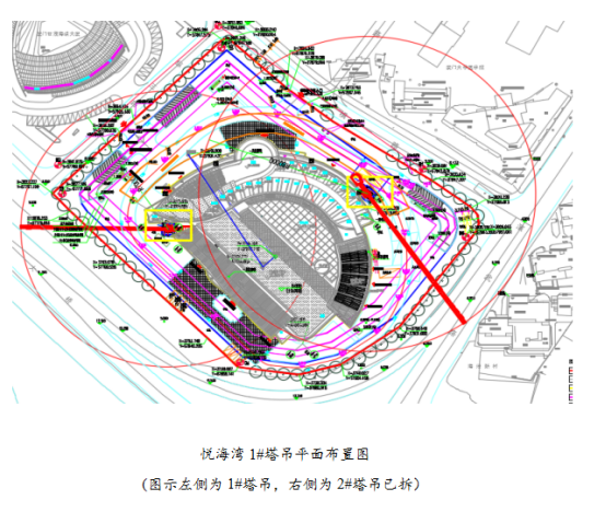 1、請告知現(xiàn)場塔樓施工塔吊的型號、拆除時間、端部最大吊裝能力及平面布置圖。