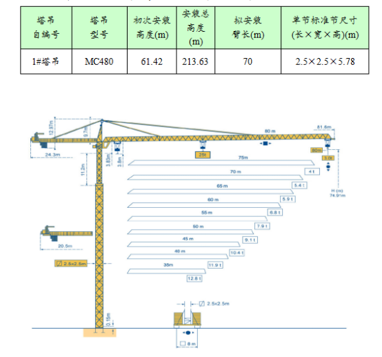 答:計劃8月中旬拆除1#塔吊。端部最大吊裝能力及平面布置圖如下: